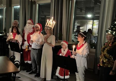 På fredagsmorgonen fick vi besök av Lucia. För pianomusiken svarade Birgitta Lindh. I övrigt innehöll luciatåget idel kända ansikten från den egna klubben: